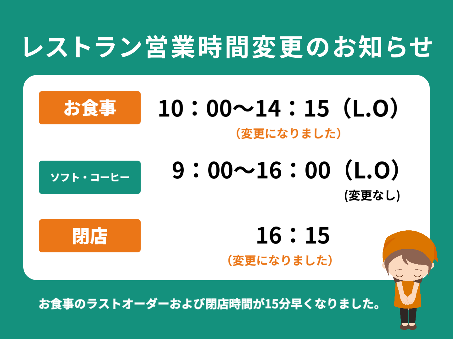 ■ 閉店時間 変更前:16:30 ➡ 変更後:16:15 ※閉店時間が15分早くなりました。
